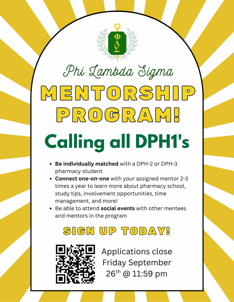 The mentorship program is a way for DPH-1 students, pre-pharmacy students, and pharm-tox students to connect with current leaders within the School of Pharmacy. We pair mentees with current PLS members in the beginning of the fall semester based on similar interests/backgrounds. This provides interested students with the ability to make an instant connection within the school of pharmacy and to feel more comfortable as they begin their journey to a PharmD.